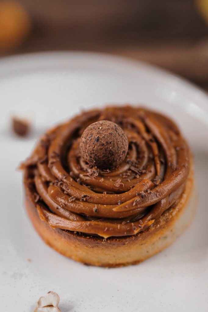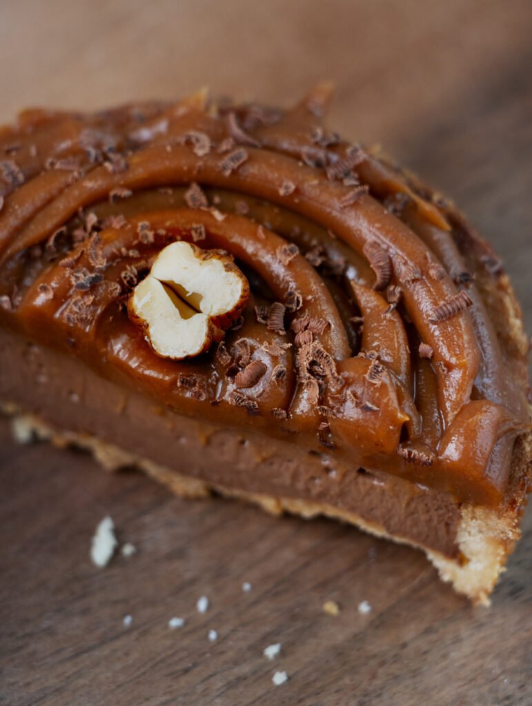 Es entsteht dieses Törtchen mit einer Oberfläche, die sanft nachgibt, wenn man sie anschneidet. Das Karamell ist weich, buttrig, schmilzt fast von selbst – warm, rund, mit feiner Würze von Zimt und Orange. Darunter liegt die Nougat-Ganache: zart, cremig, mit einer leisen Bitterkeit von dunkler Schokolade.