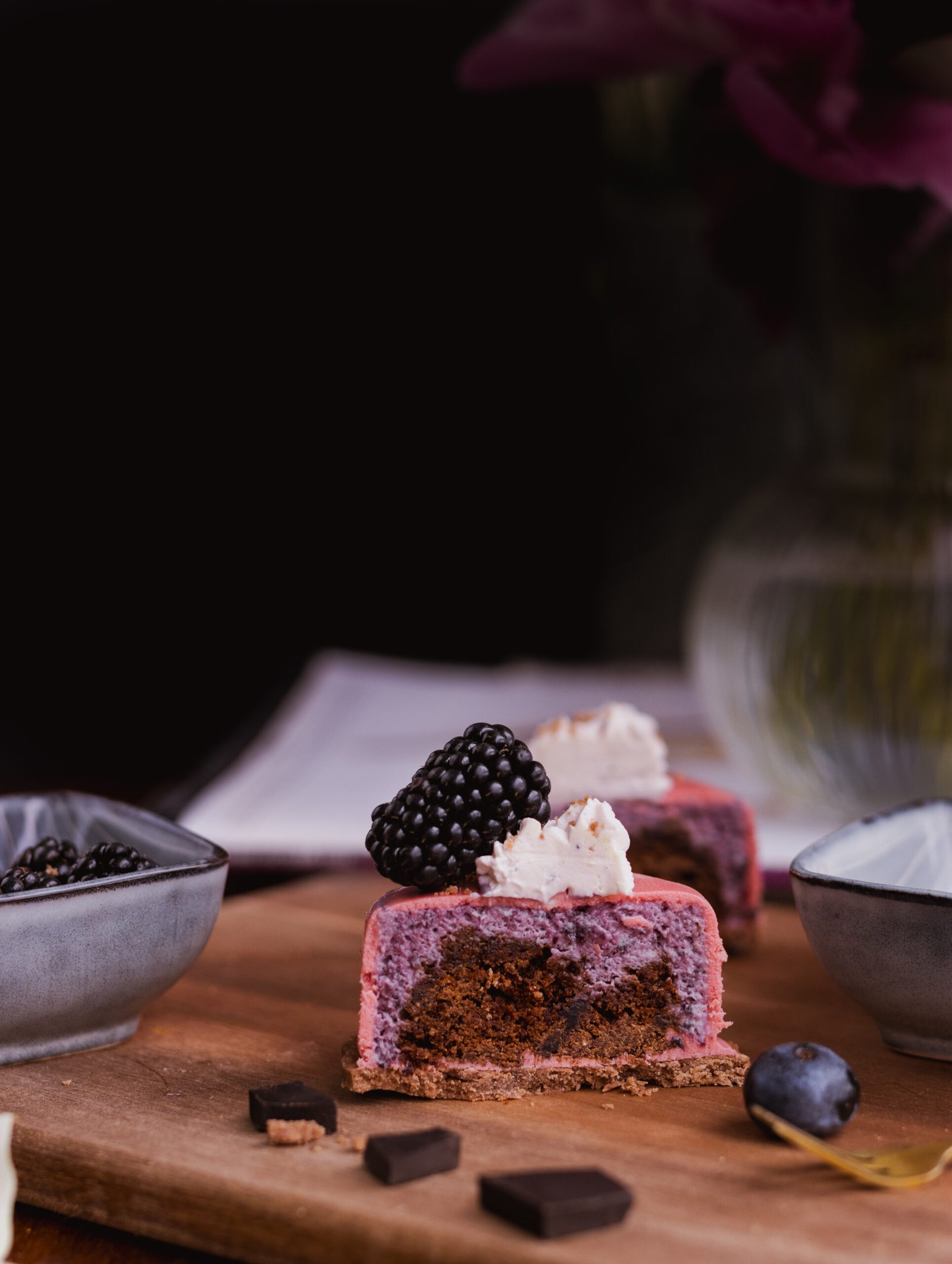 Zwei Varianten als Topping: eine aufgeschlagene Ganache aus Wilder Heidelbeere oder eine Cream-Cheese-Creme – beide ergänzt durch eine frische Brombeere für das fruchtige Extra obenauf.