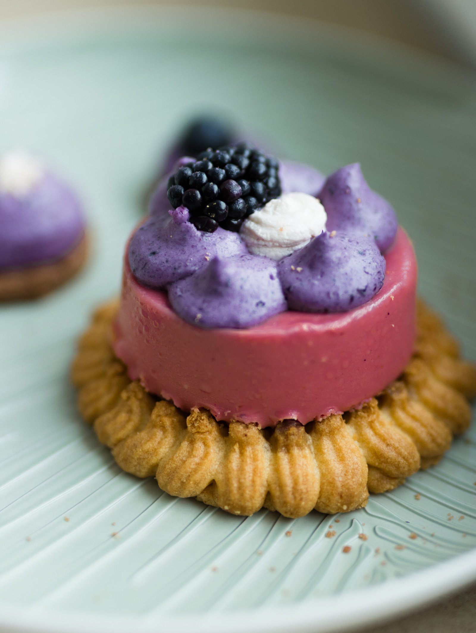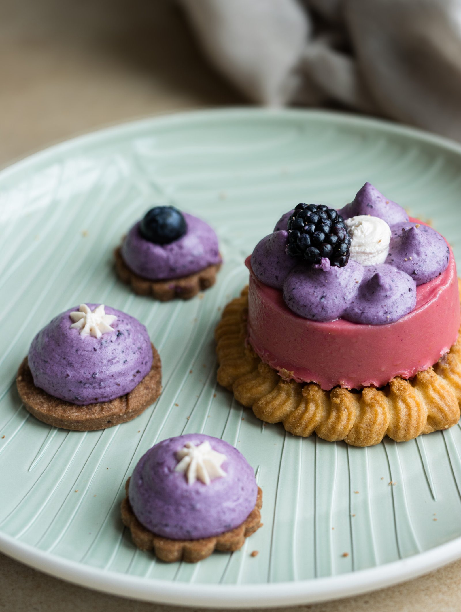 Fruchtiges Tartelette mit Waldbeermousse, Brownie-Keks & Wilde Heidelbeere Topping