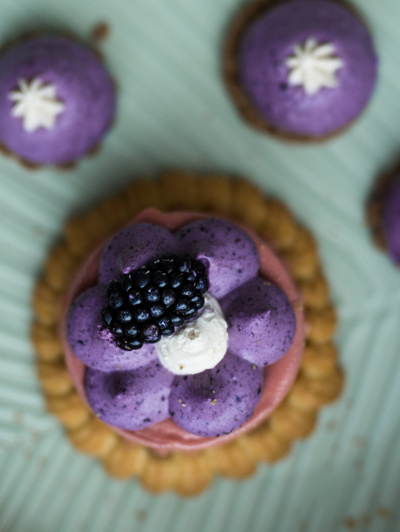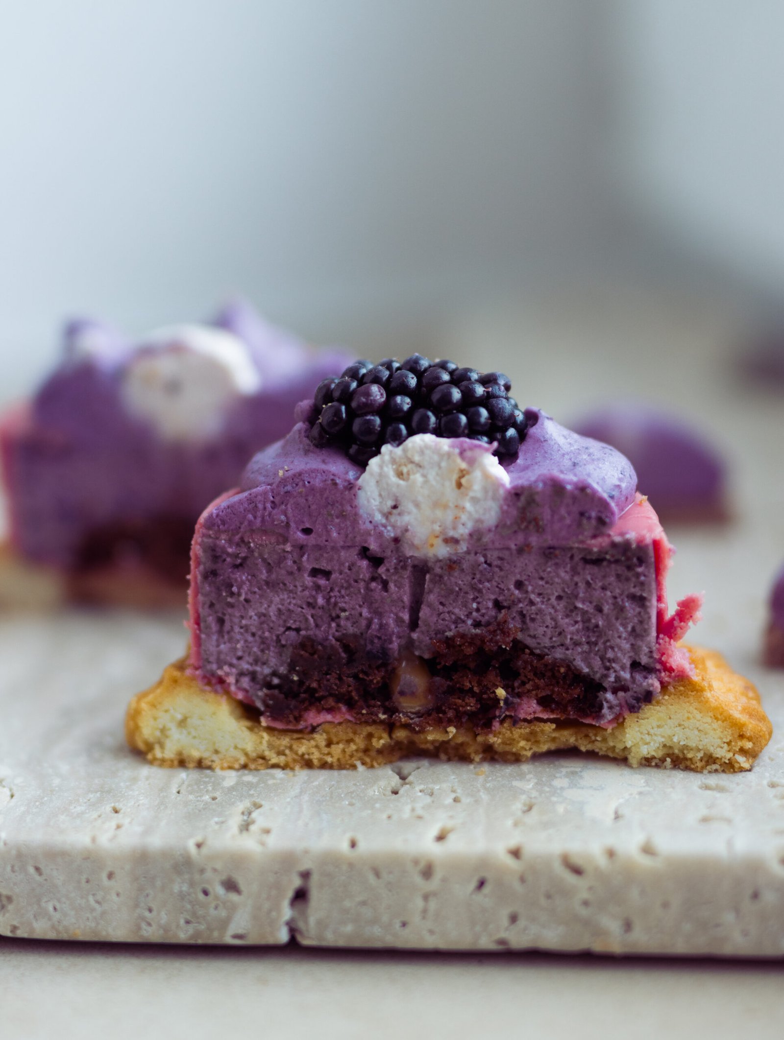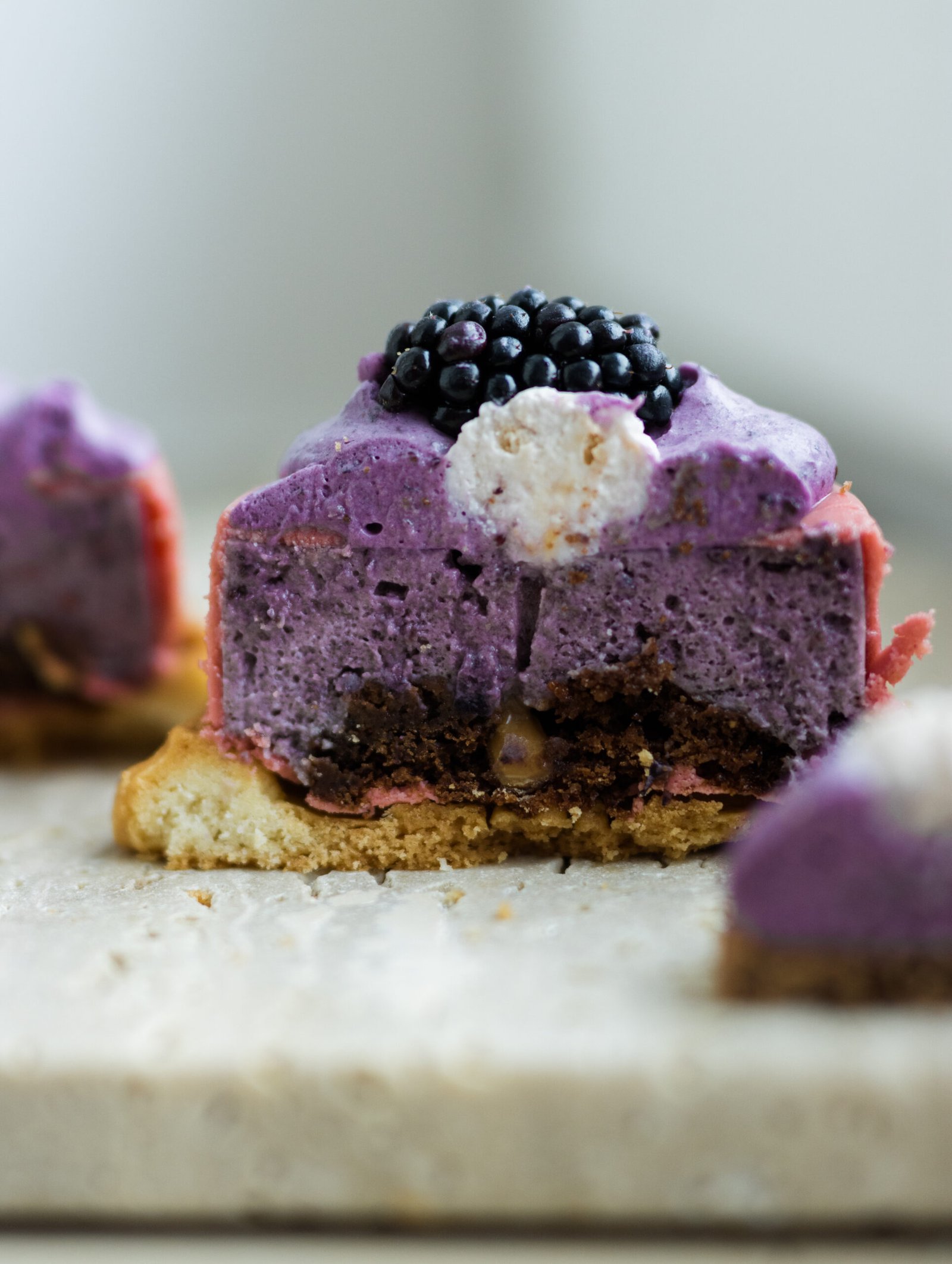 Den Dessertkern von diesem Sommertörtchen bildet der fudgy Brownie Cookie mit goldenen Karamellstückchen (ein Brookie), umhüllt von einer Waldbeermousse und feiner Glasur. Das Topping besteht als Kontrast mal aus einer Cream Cheese/Mascarpone Creme und mal mit einer Wilde Heidelbeerganache und mittigem Cream Cheese – Mascarpone Tupfer. Obendrauf gibt es frische Brombeeren.