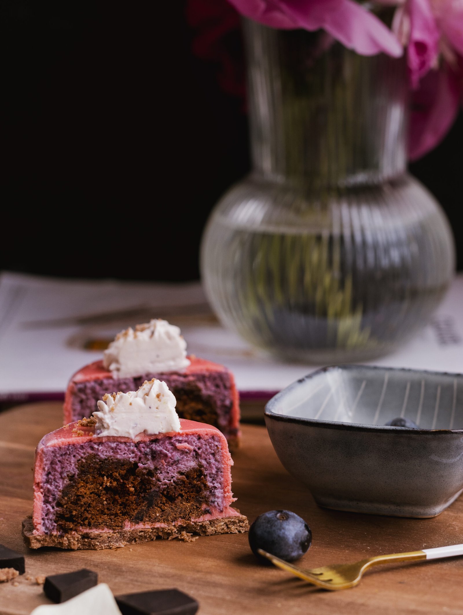 Zum Schluss wird dekoriert: Entweder nur mit der aufgeschlagenen Ganache aus Wilder Heidelbeere oder einer Frischkäse-Mascarpone-Creme obendrauf. Hier ist eure Fantasie bzw die Geschmacksvorliebe gefragt.